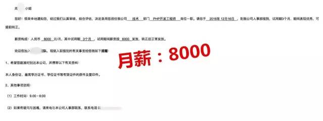 毕业后不久在就业老师的帮助下,我入职了上海一家公司,担任公司PHP开发工程师职位,月薪:8000元。虽然目前来说月薪不是我们班里最好的,但是我很知足。在这个公司工作了有一段时间了,学到的东西还是比较多的,对我的整个成长有很大帮助!