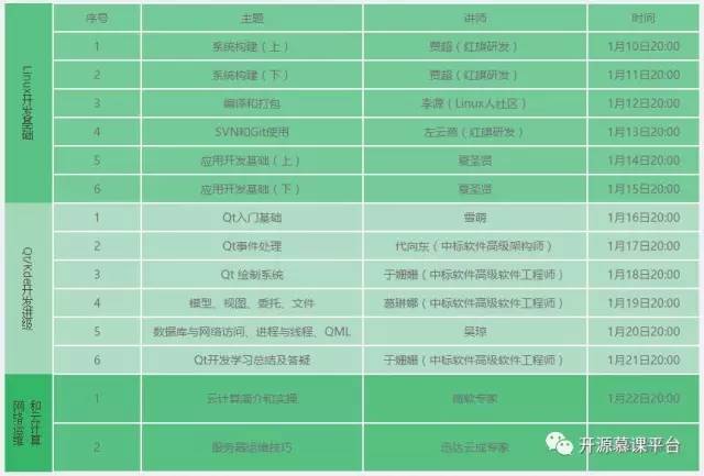 本次线上集训分成Linux开发基础、Qt/KDE开发进级、网络运维云计算等三个单元。