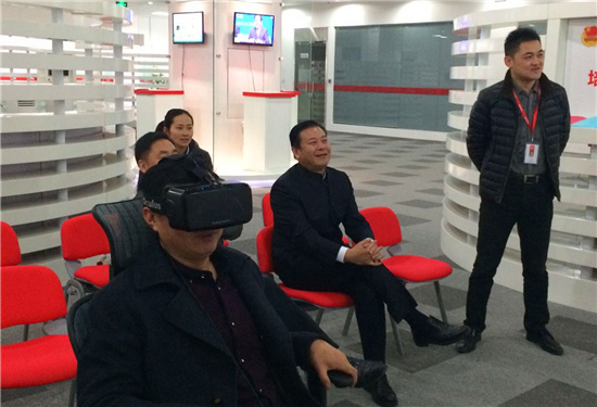 在邢经理的引导下,倪书记一行来到云和技术体验中心,听取了云和基于Unity最新的技术报告,并亲身体验了云和数据基于Unity3D开发的虚拟现实项目。